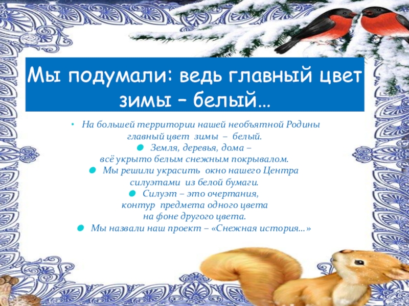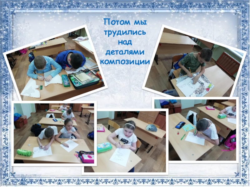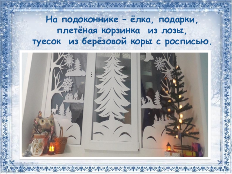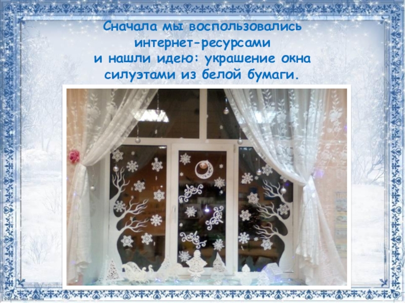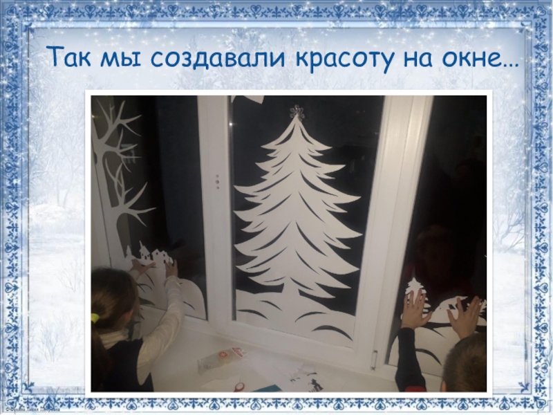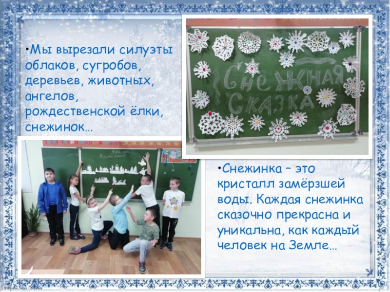•Мы вырезали силуэты облаков, сугробов, деревьев, животных, ангелов, рождественской ёлки, снежинок…