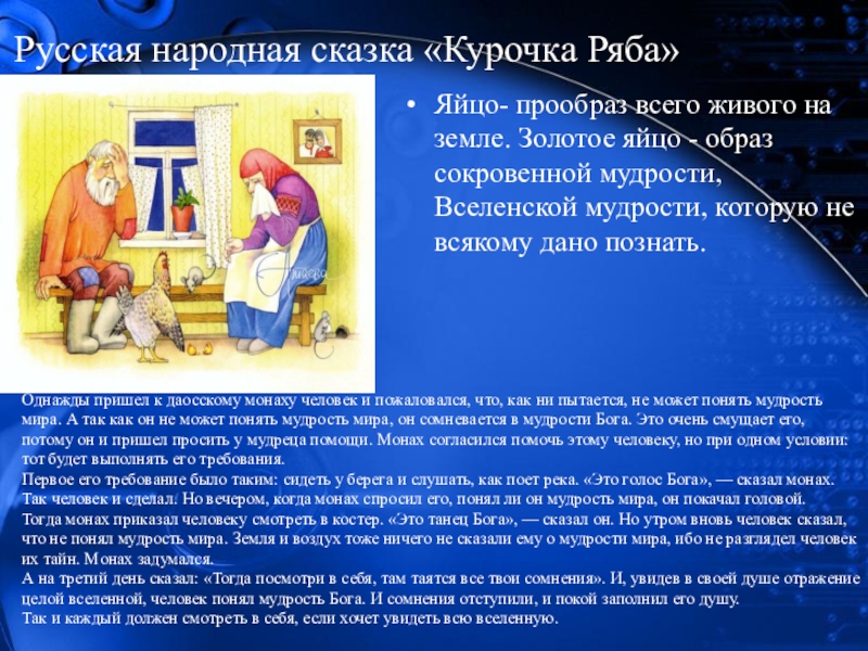 Однажды пришел к даосскому монаху человек и пожаловался, что, как ни пытается, не может понять мудрость мира. А так как он не может понять мудрость мира, он сомневается в мудрости Бога. Это очень смущает его, потому он и пришел просить у мудреца помощи. Монах согласился помочь этому человеку, но при одном условии: тот будет выполнять его требования.
