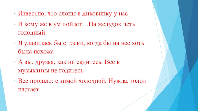 Известно, что слоны в диковинку у нас И кому же в ум пойдет…На желудок петь голодныйЯ удавилась