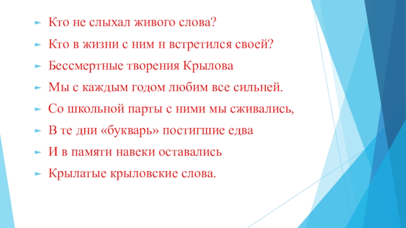 Кто не слыхал живого слова?Кто в жизни с ним н встретился своей?Бессмертные творения КрыловаМы с каждым годом