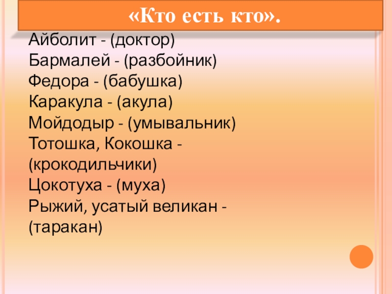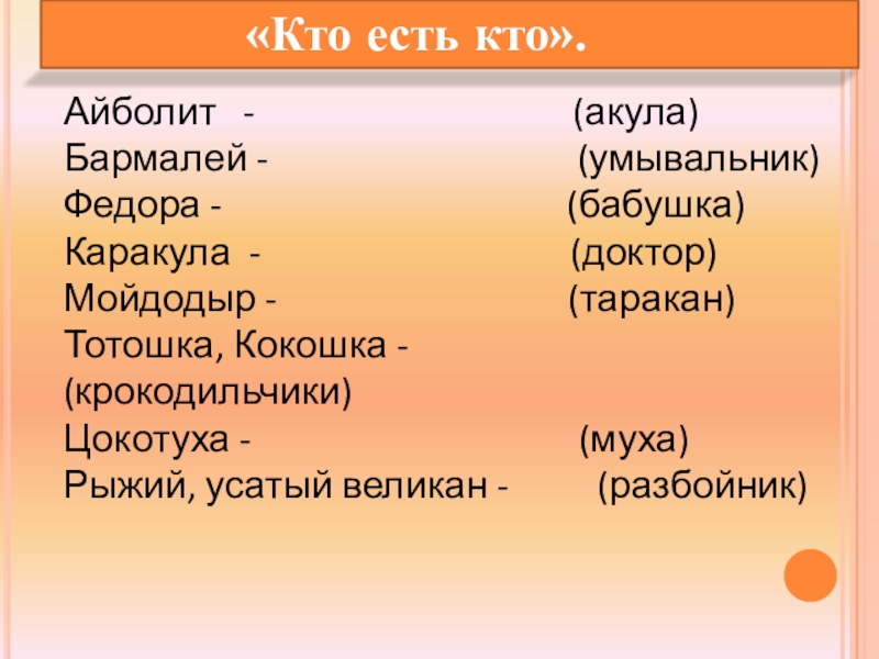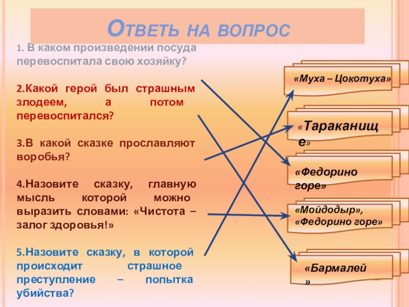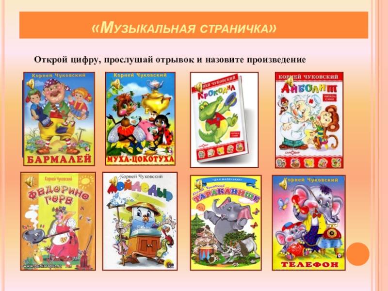 «Путаница», «Тарканище», «Мойдодыр», «Телефон», «Бармалей», «Краденое солнце», «Крокодил»