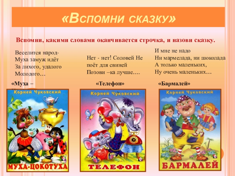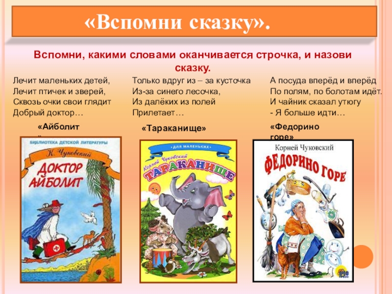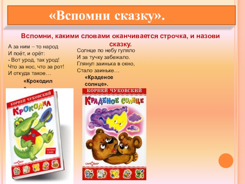 Вспомни, какими словами оканчивается строчка, и назови сказку.