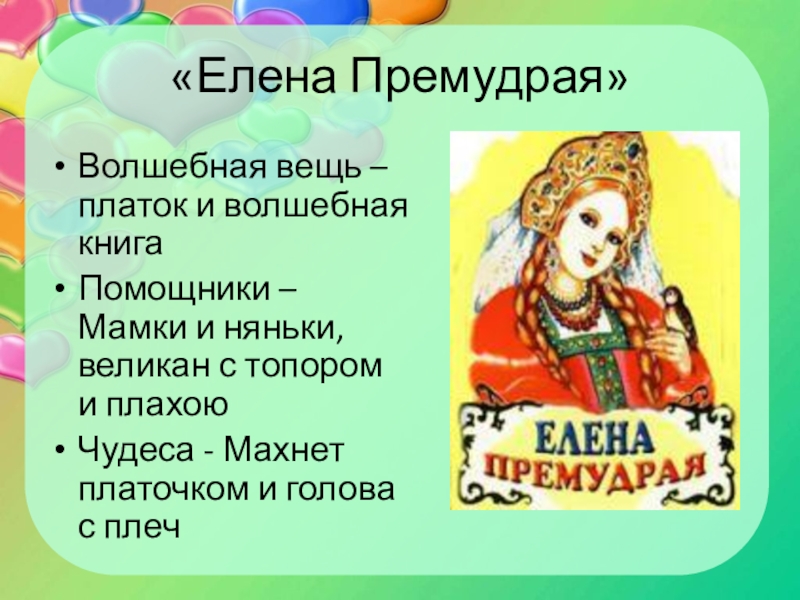 «Елена Премудрая»Волшебная вещь – платок и волшебная книгаПомощники – Мамки и няньки, великан с топором и плахоюЧудеса