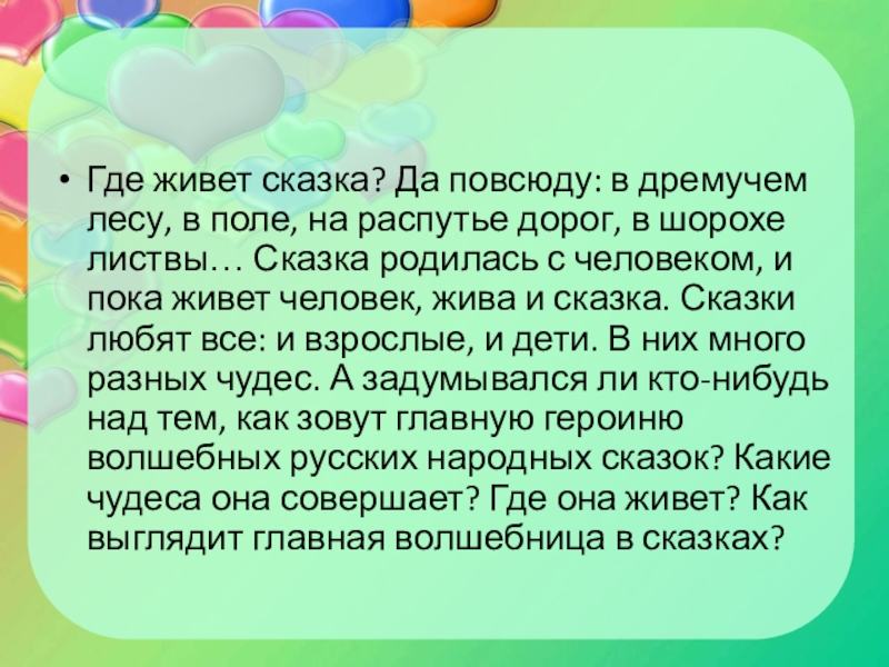 распутье дорог, в шорохе листвы… Сказка родилась с человеком, и пока живет человек, жива и сказка. Сказки любят все: и взрослые, и дети. В них много разных чудес. А задумывался ли кто-нибудь над тем, как зовут главную героиню волшебных русских народных сказок? Какие чудеса она совершает? Где она живет? Как выглядит главная волшебница в сказках?