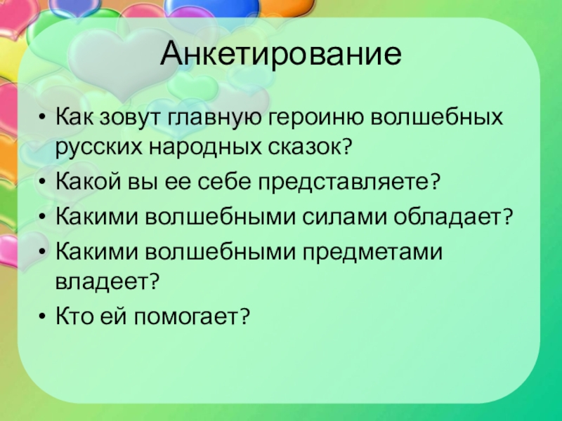 Анкетирование Как зовут главную героиню волшебных русских народных сказок?Какой вы ее себе представляете?Какими волшебными силами обладает?Какими волшебными