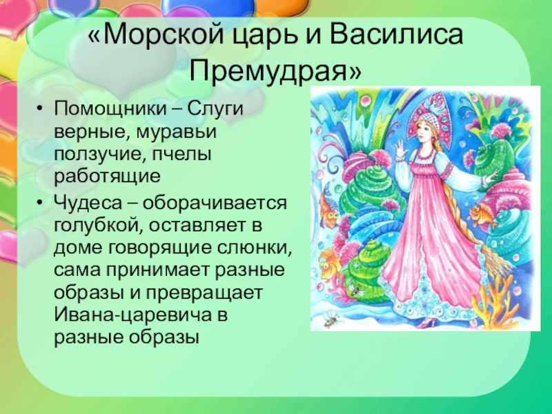 «Морской царь и Василиса Премудрая»Помощники – Слуги верные, муравьи ползучие, пчелы работящиеЧудеса – оборачивается голубкой, оставляет в