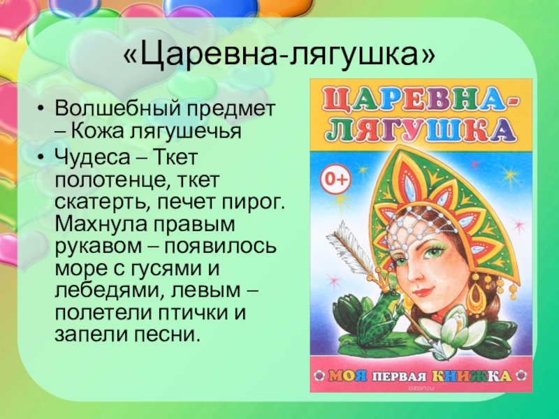 «Царевна-лягушка»Волшебный предмет – Кожа лягушечьяЧудеса – Ткет полотенце, ткет скатерть, печет пирог. Махнула правым рукавом – появилось