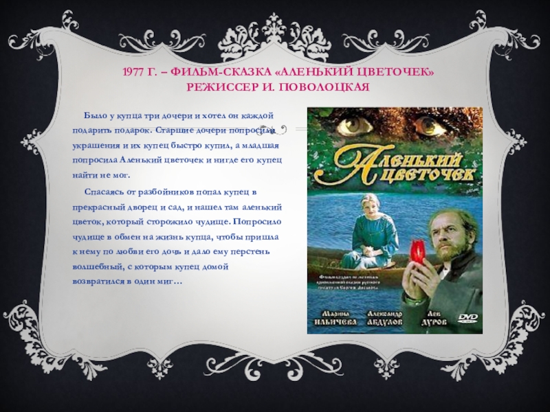 1977 г. – фильм-сказка «Аленький цветочек» Режиссер И. Поволоцкая