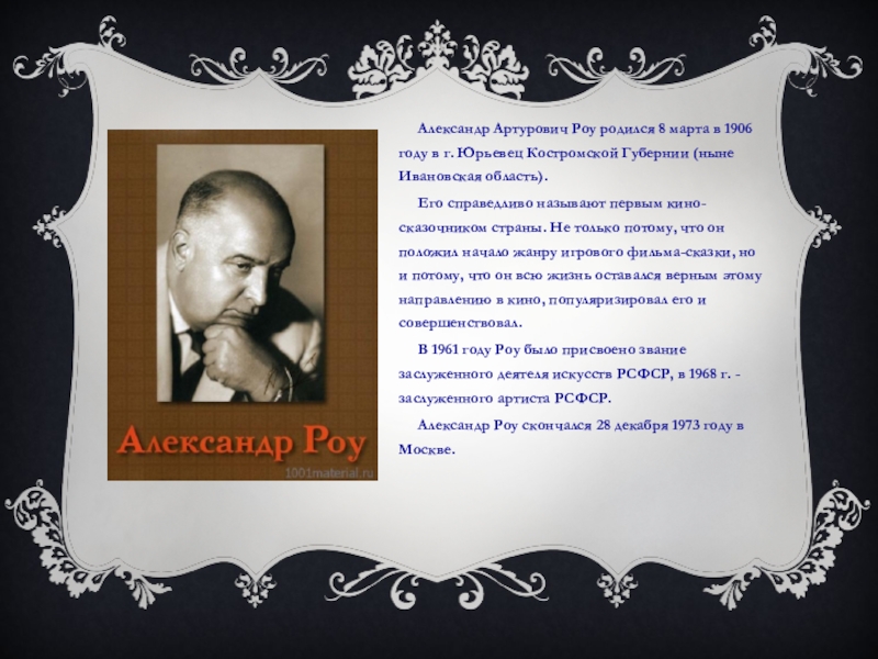 Его справедливо называют первым кино-сказочником страны. Не только потому, что он положил начало жанру игрового фильма-сказки, но и потому, что он всю жизнь оставался верным этому направлению в кино, популяризировал его и совершенствовал.