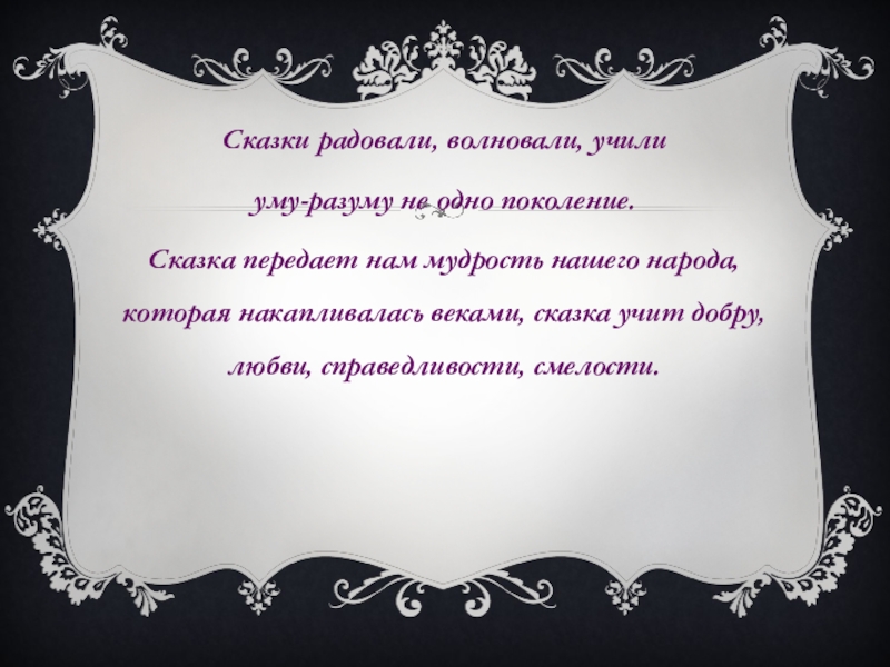 мудрость нашего народа, которая накапливалась веками, сказка учит добру, любви, справедливости, смелости.