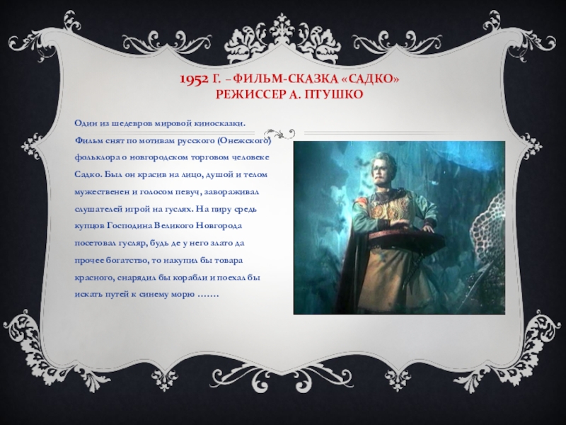 фольклора о новгородском торговом человеке Садко. Был он красив на лицо, душой и телом мужественен и голосом певуч, завораживал слушателей игрой на гуслях. На пиру средь купцов Господина Великого Новгорода посетовал гусляр, будь де у него злато да прочее богатство, то накупил бы товара красного, снарядил бы корабли и поехал бы искать путей к синему морю …….