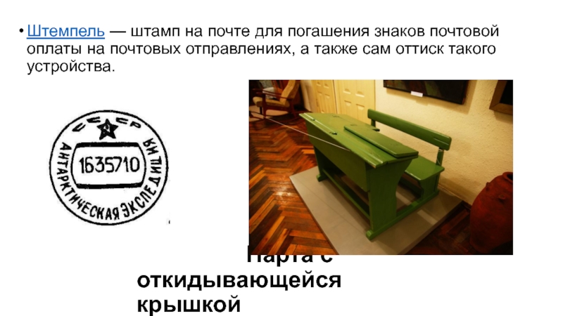 Штемпель — штамп на почте для погашения знаков почтовой оплаты на почтовых отправлениях, а также сам оттиск такого устройства.
