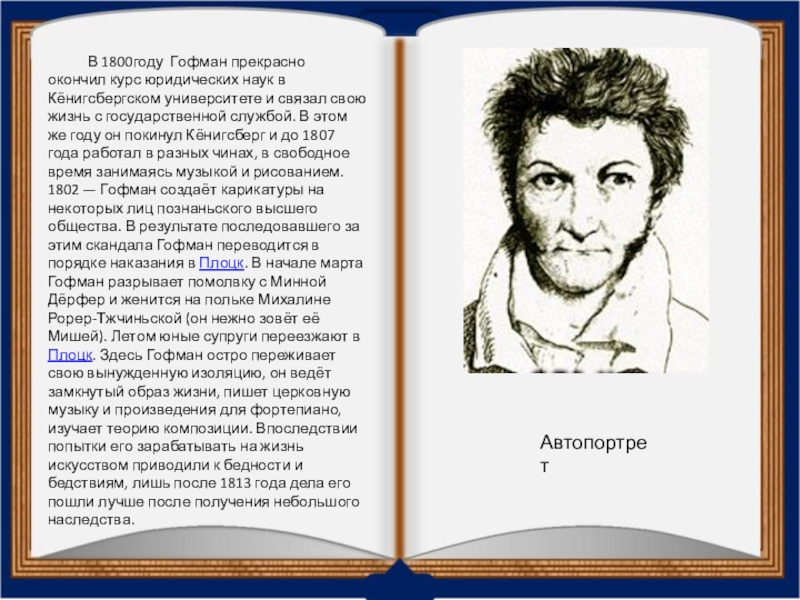 и связал свою жизнь с государственной службой. В этом же году он покинул Кёнигсберг и до 1807 года работал в разных чинах, в свободное время занимаясь музыкой и рисованием. 1802 — Гофман создаёт карикатуры на некоторых лиц познаньского высшего общества. В результате последовавшего за этим скандала Гофман переводится в порядке наказания в Плоцк. В начале марта Гофман разрывает помолвку с Минной Дёрфер и женится на польке Михалине Рорер-Тжчиньской (он нежно зовёт её Мишей). Летом юные супруги переезжают в Плоцк. Здесь Гофман остро переживает свою вынужденную изоляцию, он ведёт замкнутый образ жизни, пишет церковную музыку и произведения для фортепиано, изучает теорию композиции. Впоследствии попытки его зарабатывать на жизнь искусством приводили к бедности и бедствиям, лишь после 1813 года дела его пошли лучше после получения небольшого наследства.