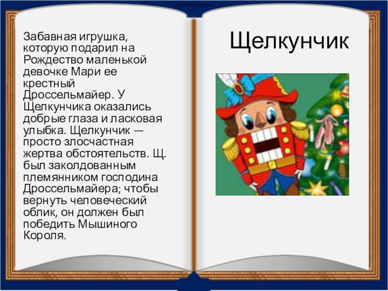 Дроссельмайер. У Щелкунчика оказались добрые глаза и ласковая улыбка. Щелкунчик — просто злосчастная жертва обстоятельств. Щ. был заколдованным племянником господина Дроссельмайера; чтобы вернуть человеческий облик, он должен был победить Мышиного Короля.