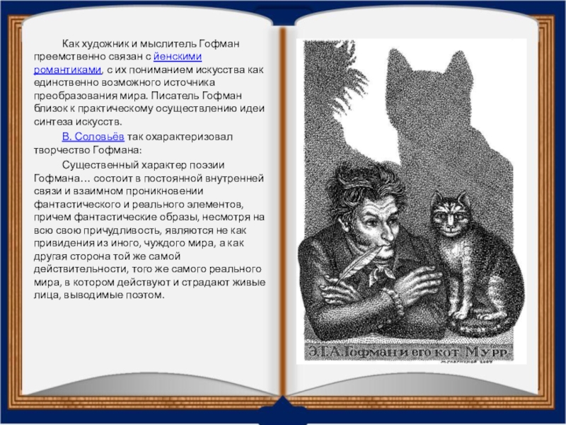 Слайд 10Как художник и мыслитель Гофман преемственно связан с йенскими романтиками, с