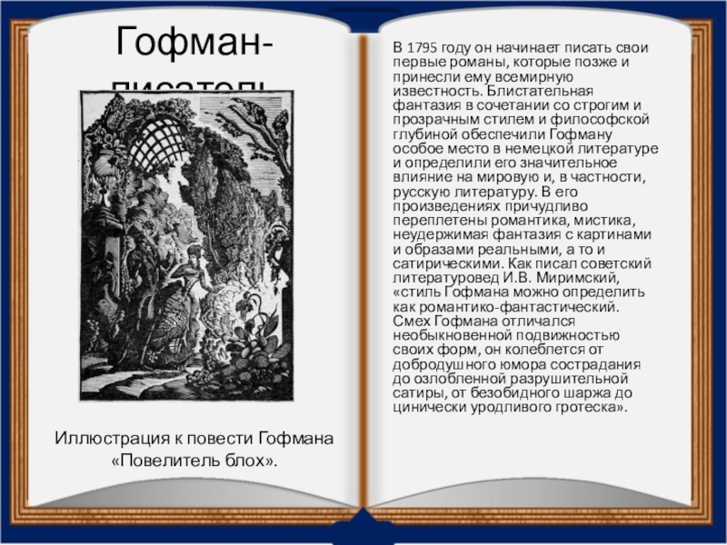 и принесли ему всемирную известность. Блистательная фантазия в сочетании со строгим и прозрачным стилем и философской глубиной обеспечили Гофману особое место в немецкой литературе и определили его значительное влияние на мировую и, в частности, русскую литературу. В его произведениях причудливо переплетены романтика, мистика, неудержимая фантазия с картинами и образами реальными, а то и сатирическими. Как писал советский литературовед И.В. Миримский, «стиль Гофмана можно определить как романтико-фантастический. Смех Гофмана отличался необыкновенной подвижностью своих форм, он колеблется от добродушного юмора сострадания до озлобленной разрушительной сатиры, от безобидного шаржа до цинически уродливого гротеска».