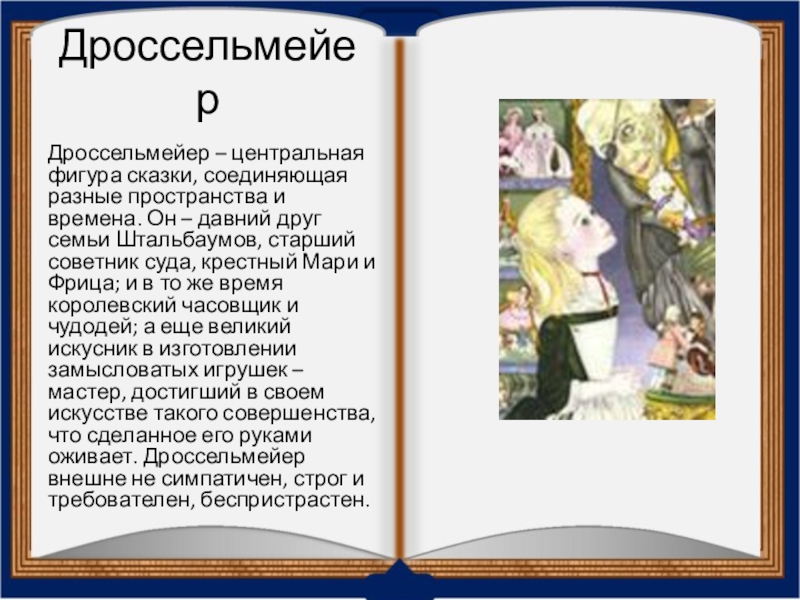 – давний друг семьи Штальбаумов, старший советник суда, крестный Мари и Фрица; и в то же время королевский часовщик и чудодей; а еще великий искусник в изготовлении замысловатых игрушек – мастер, достигший в своем искусстве такого совершенства, что сделанное его руками оживает. Дроссельмейер внешне не симпатичен, строг и требователен, беспристрастен.