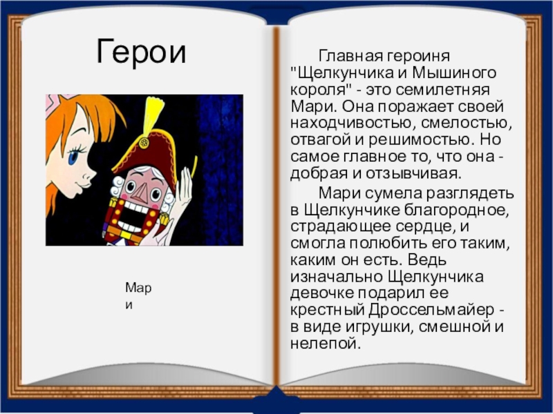 Мари сумела разглядеть в Щелкунчике благородное, страдающее сердце, и смогла полюбить его таким, каким он есть. Ведь изначально Щелкунчика девочке подарил ее крестный Дроссельмайер - в виде игрушки, смешной и нелепой.