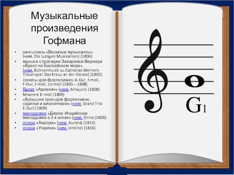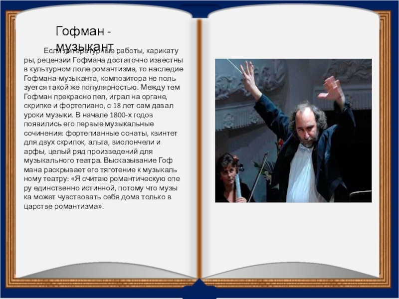 романтизма, то наследие Гофмана-музыканта, композитора не пользуется такой же популярностью. Между тем Гофман прекрасно пел, играл на органе, скрипке и фортепиано, с 18 лет сам давал уроки музыки. В начале 1800-х годов появились его первые музыкальные сочинения: фортепианные сонаты, квинтет для двух скрипок, альта, виолончели и арфы, целый ряд произведений для музыкального театра. Высказывание Гофмана раскрывает его тяготение к музыкальному театру: «Я считаю романтическую оперу единственно истинной, потому что музыка может чувствовать себя дома только в царстве романтизма».