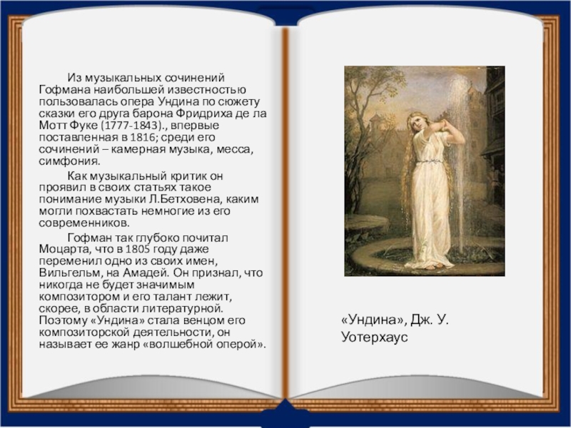 Слайд 7Из музыкальных сочинений Гофмана наибольшей известностью пользовалась опера Ундина по сюжету