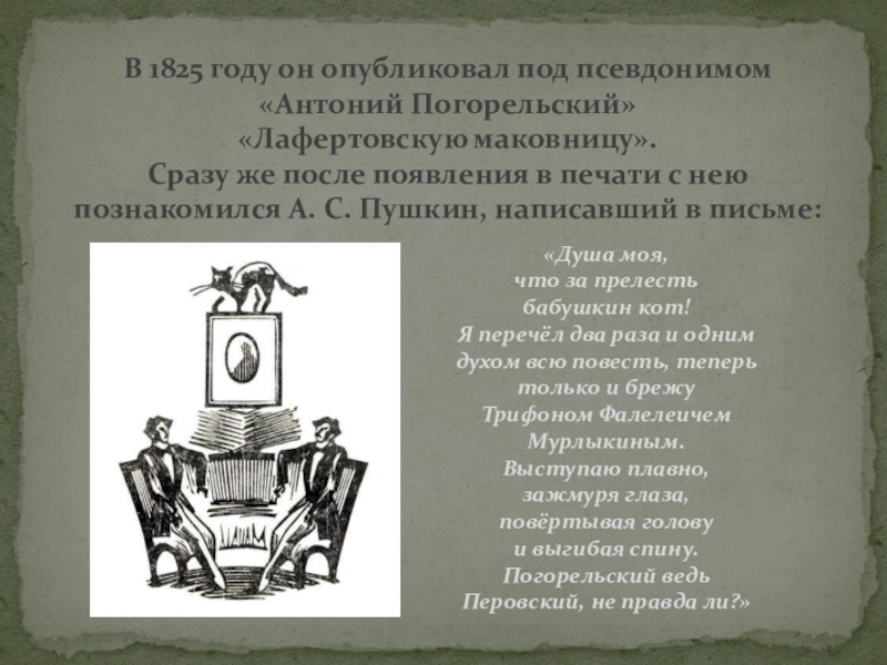 «Автор искусно воспользовался разными поверьями, тёмными слухами и суеверными рассказами о несбыточных происшествиях и передал их нам еще искуснее, умея возбуждать любопытство и поддерживать его до самой развязки»