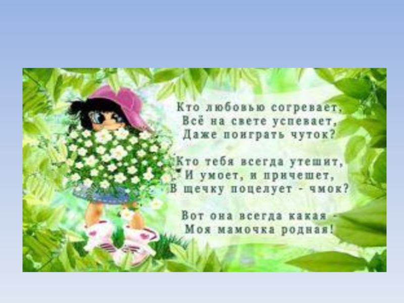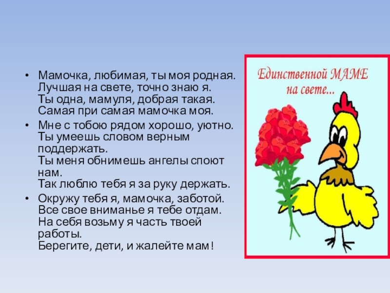 Окружу тебя я, мамочка, заботой. Все свое вниманье я тебе отдам. На себя возьму я часть твоей работы. Берегите, дети, и жалейте мам!