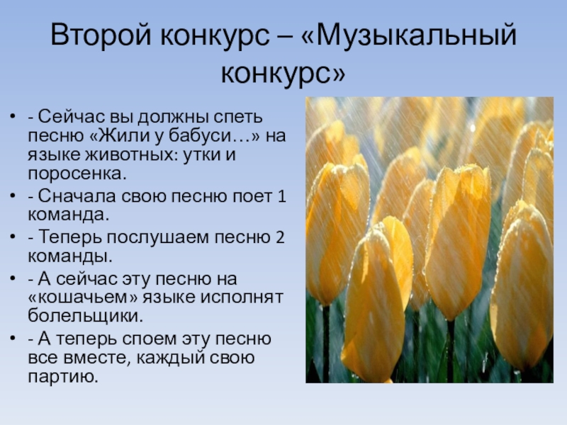 Второй конкурс – «Музыкальный конкурс»- Сейчас вы должны спеть песню «Жили у бабуси…» на языке животных: утки