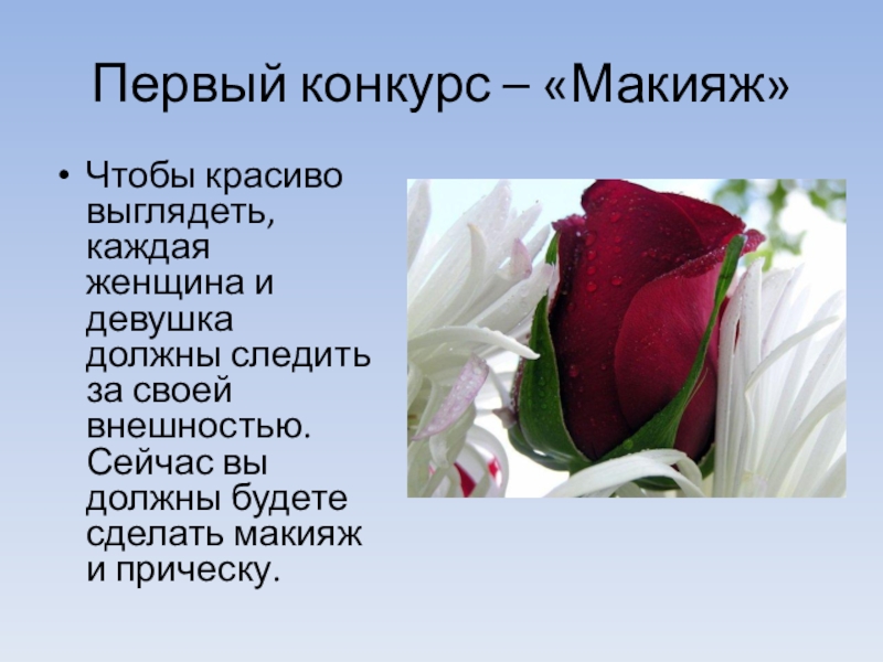 Первый конкурс – «Макияж»Чтобы красиво выглядеть, каждая женщина и девушка должны следить за своей внешностью. Сейчас вы