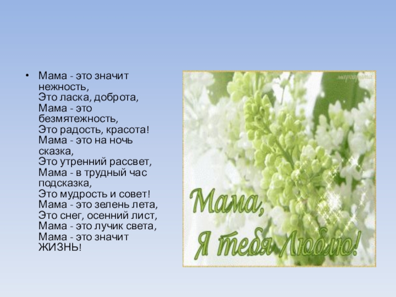 Слайд 9Мама - это значит нежность, Это ласка, доброта, Мама - это безмятежность, Это радость,