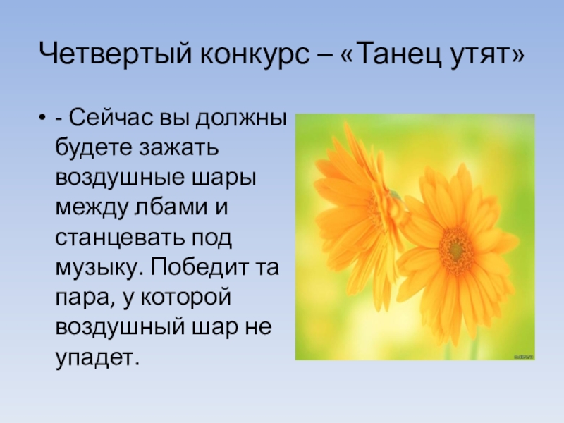 Четвертый конкурс – «Танец утят»- Сейчас вы должны будете зажать воздушные шары между лбами и станцевать под