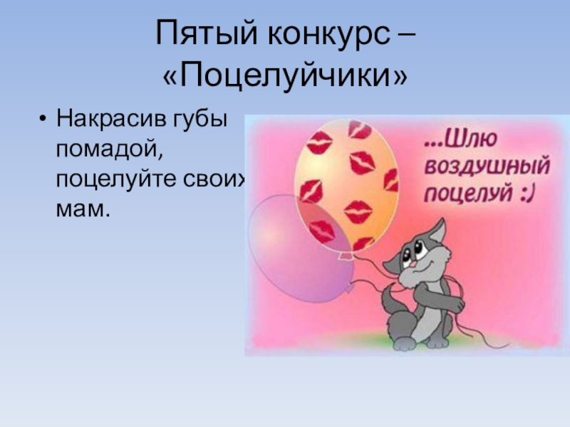 Пятый конкурс – «Поцелуйчики»Накрасив губы помадой, поцелуйте своих мам.