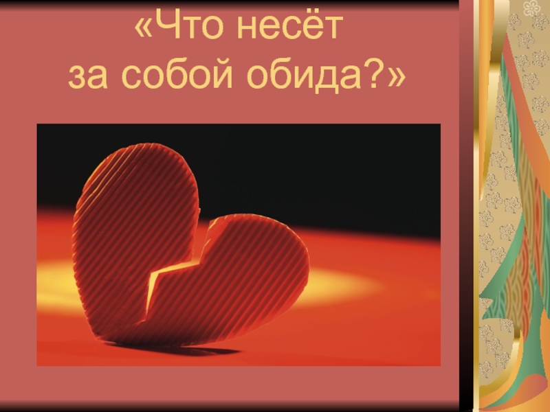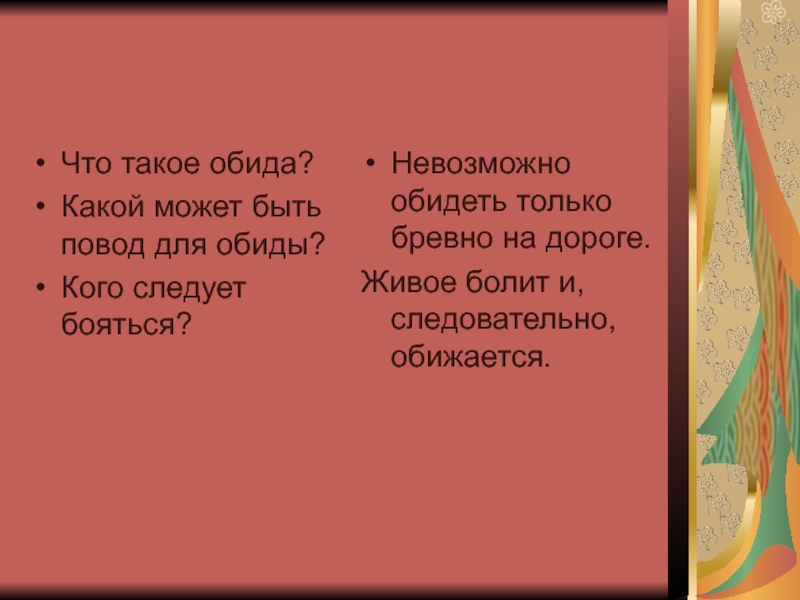 Что такое обида?Какой может быть повод для обиды?Кого следует бояться?Невозможно обидеть только бревно на дороге.Живое болит и,