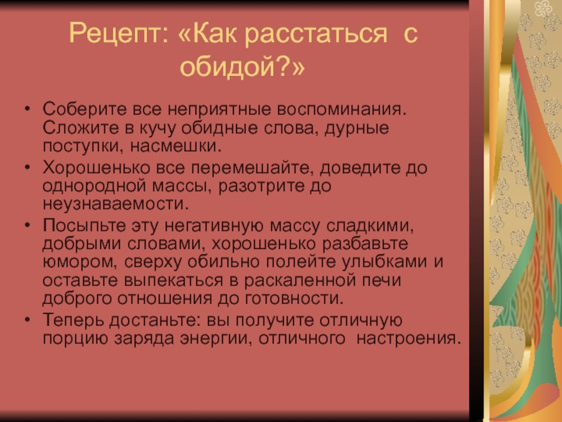 Слайд 7Рецепт: «Как расстаться с обидой?»
