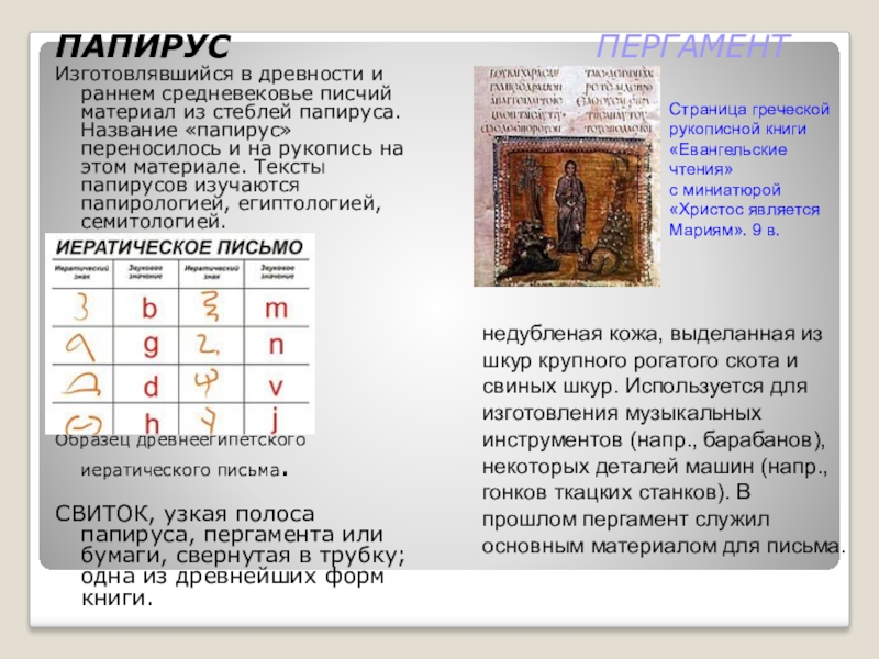 недубленая кожа, выделанная из шкур крупного рогатого скота и свиных шкур. Используется для изготовления музыкальных инструментов (напр., барабанов), некоторых деталей машин (напр., гонков ткацких станков). В прошлом пергамент служил основным материалом для письма.