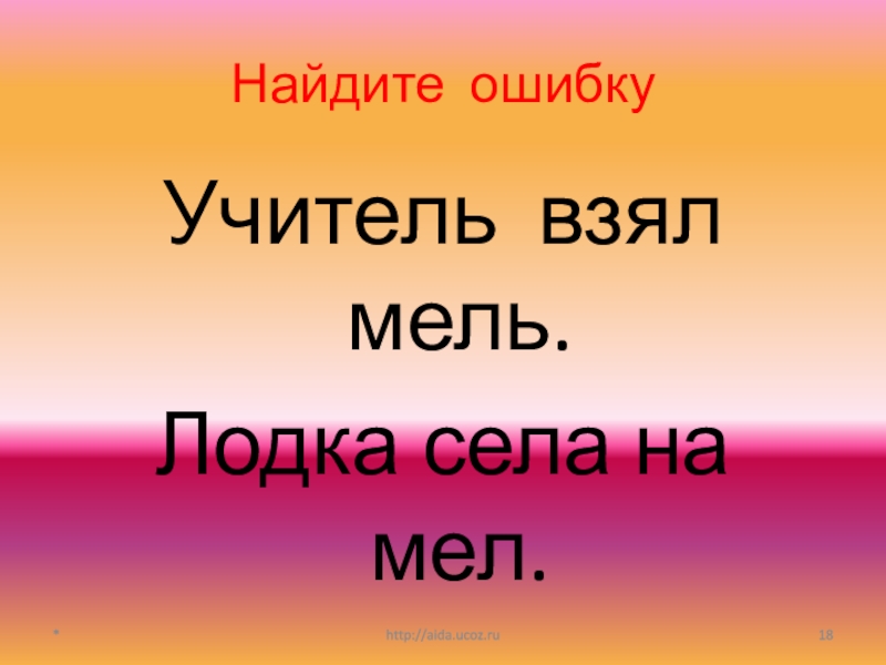 Найдите ошибку Учитель взял мель. Лодка села на мел.*http://aida.ucoz.ru