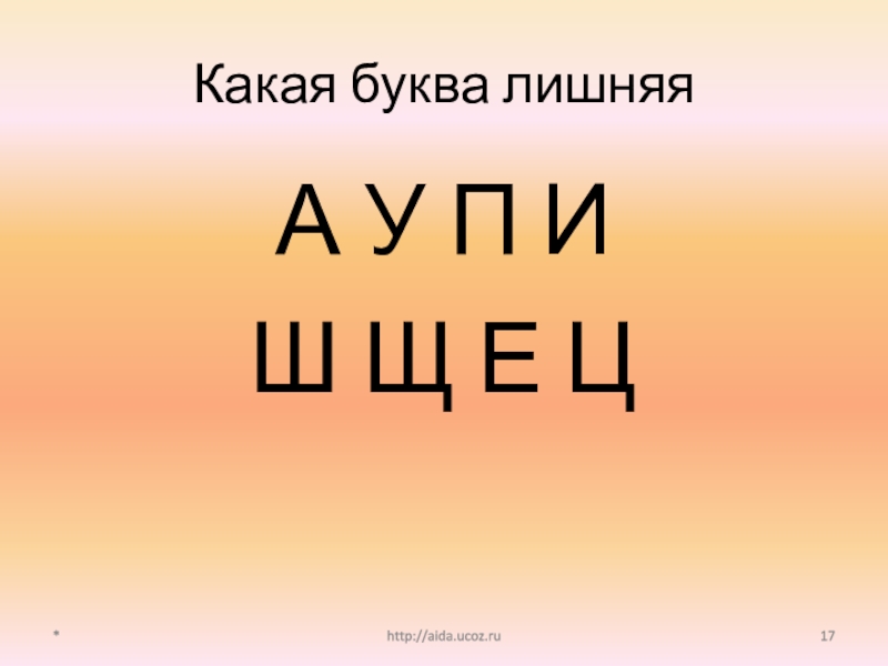 Какая буква лишняяА У П И Ш Щ Е Ц*http://aida.ucoz.ru