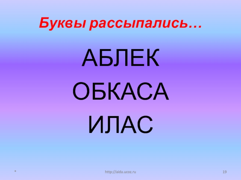 Буквы рассыпались…АБЛЕКОБКАСАИЛАС*http://aida.ucoz.ru