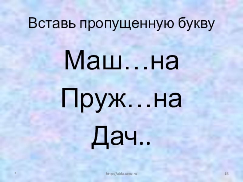 Вставь пропущенную буквуМаш…наПруж…наДач..*http://aida.ucoz.ru