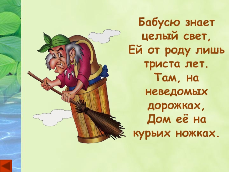 Слайд 9Бабусю знает целый свет, Ей от роду лишь триста лет. Там, на неведомых