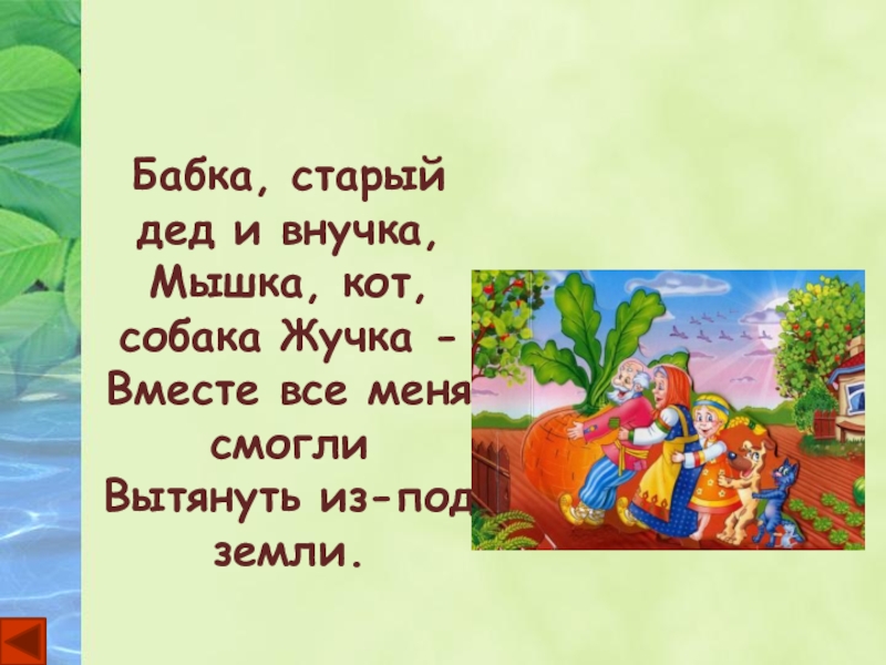 Бабка, старый дед и внучка,  Мышка, кот, собака Жучка - Вместе все меня смогли Вытянуть из-под