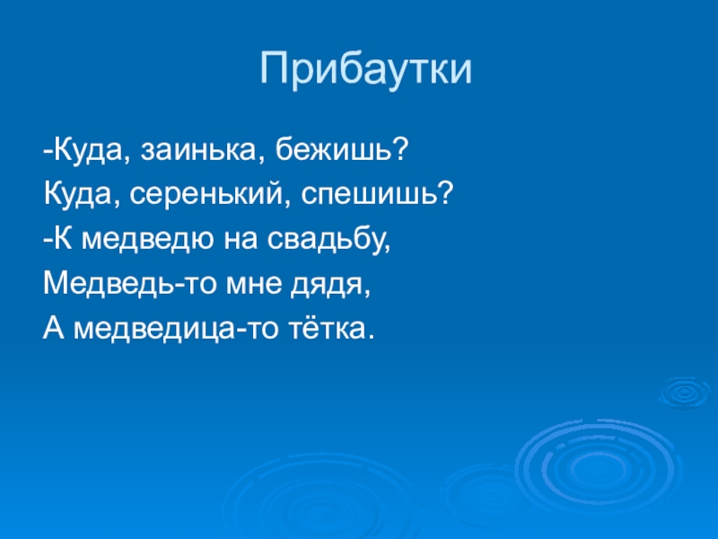 Прибаутки-Куда, заинька, бежишь?Куда, серенький, спешишь?-К медведю на свадьбу,Медведь-то мне дядя,А медведица-то тётка.
