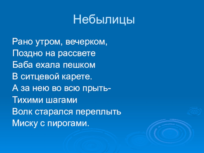 НебылицыРано утром, вечерком,Поздно на рассветеБаба ехала пешкомВ ситцевой карете.А за нею во всю прыть-Тихими шагамиВолк старался переплытьМиску