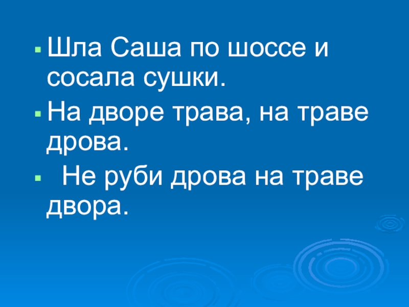 Шла Саша по шоссе и сосала сушки.На дворе трава, на траве дрова. Не руби дрова на траве