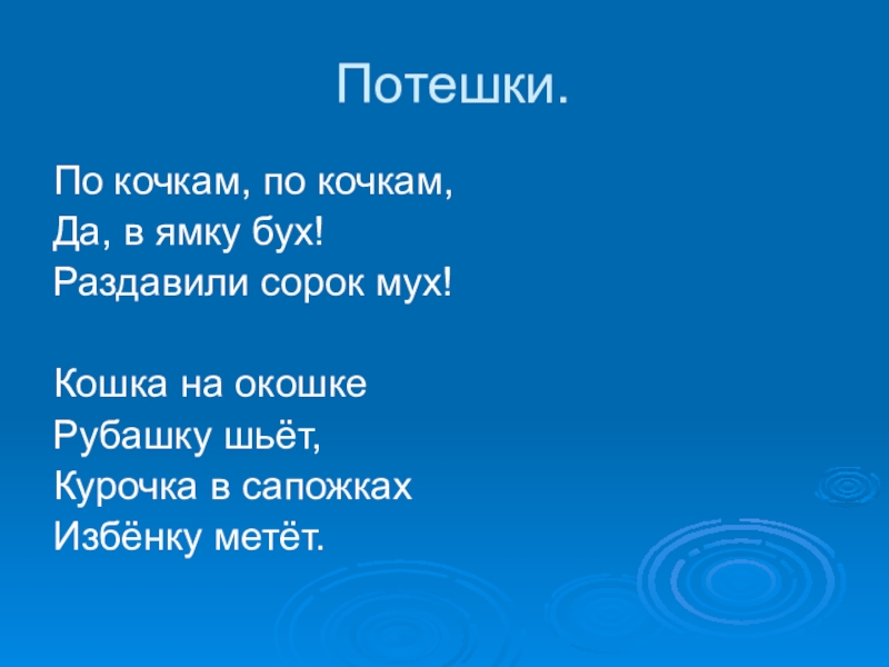 Потешки.По кочкам, по кочкам,Да, в ямку бух!Раздавили сорок мух! Кошка на окошке Рубашку шьёт,Курочка в сапожкахИзбёнку метёт.