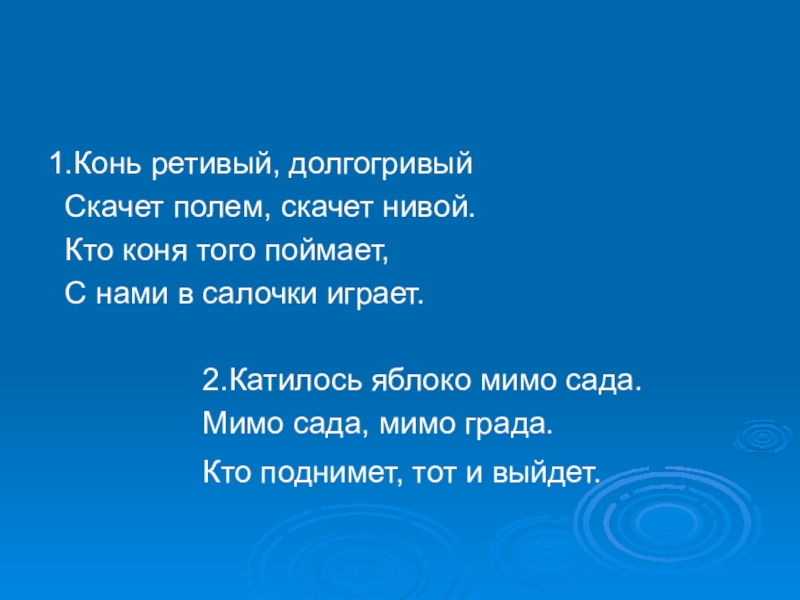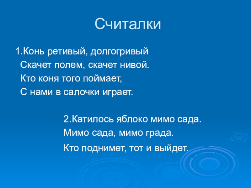 Считалки1.Конь ретивый, долгогривый Скачет полем, скачет нивой. Кто коня того поймает, С нами в салочки играет.