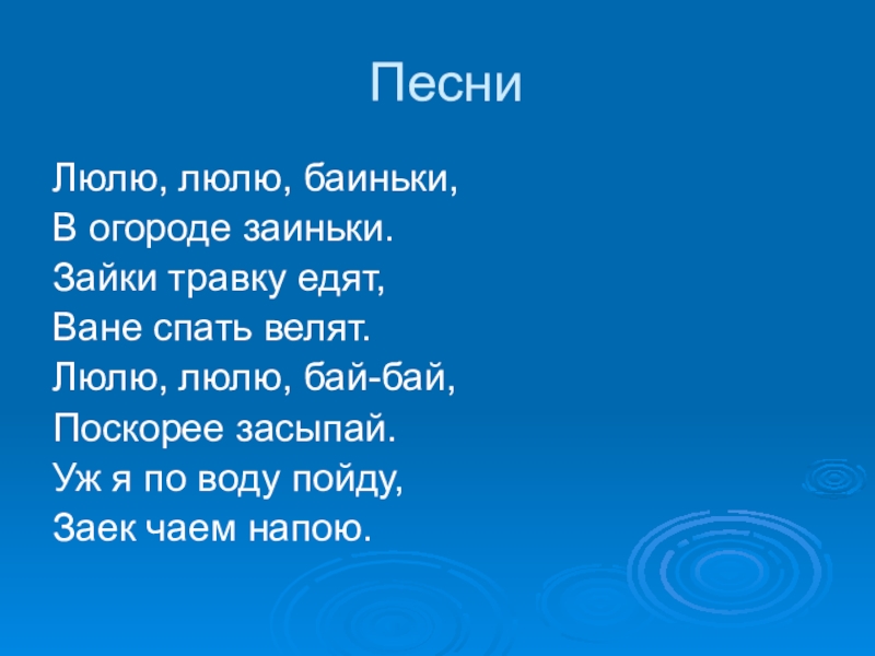 ПесниЛюлю, люлю, баиньки,В огороде заиньки.Зайки травку едят,Ване спать велят.Люлю, люлю, бай-бай,Поскорее засыпай.Уж я по воду пойду, Заек