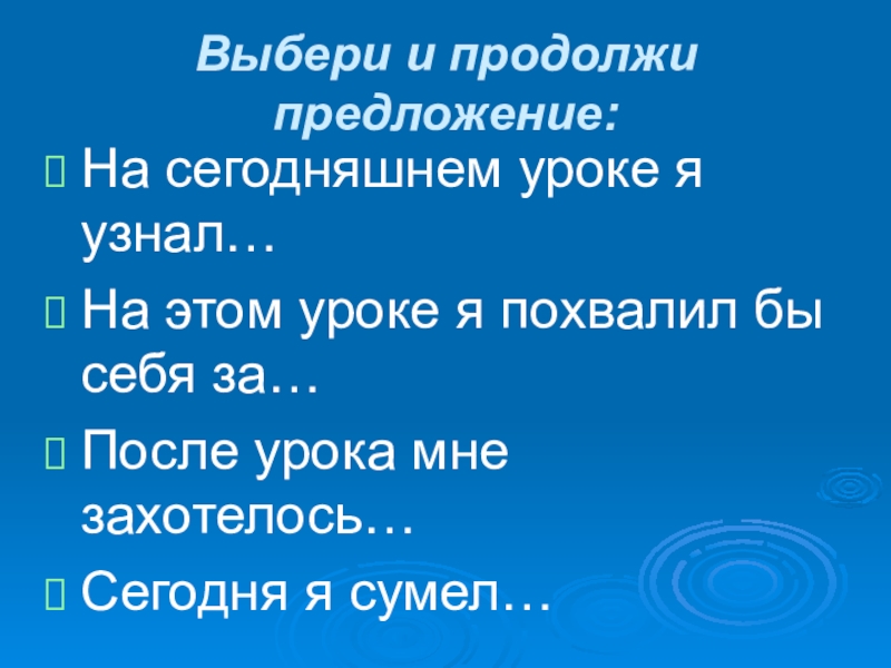 Выбери и продолжи предложение:На сегодняшнем уроке я узнал…На этом уроке я похвалил бы себя за…После урока мне