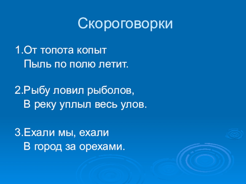 Скороговорки1.От топота копыт  Пыль по полю летит.2.Рыбу ловил рыболов,  В реку уплыл весь улов.3.Ехали мы,