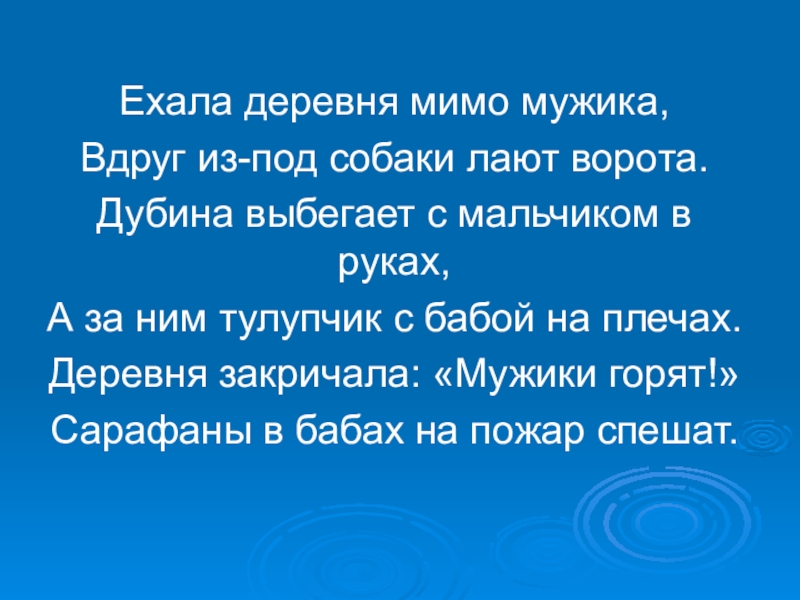 Ехала деревня мимо мужика,Вдруг из-под собаки лают ворота.Дубина выбегает с мальчиком в руках,А за ним тулупчик