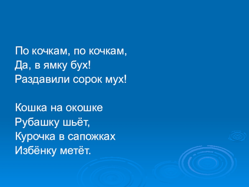 По кочкам, по кочкам,Да, в ямку бух!Раздавили сорок мух! Кошка на окошке Рубашку шьёт,Курочка в сапожкахИзбёнку метёт.